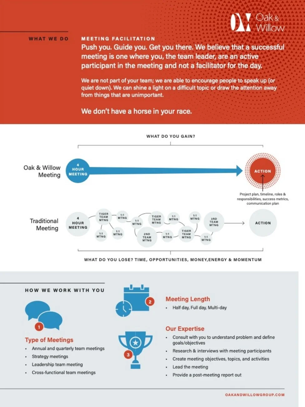 Facilitating meetings that are both purposeful and engaging, Oak & Willow Group drives real outcomes. Our expert facilitators ensure every meeting is productive, keeping discussions focused and actionable. By streamlining your meeting processes, we help your team save valuable time and resources. Who needs more wasted company time, anyway? Optimize your organization's efficiency with our professional meeting facilitation services and witness the difference in your team's performance.